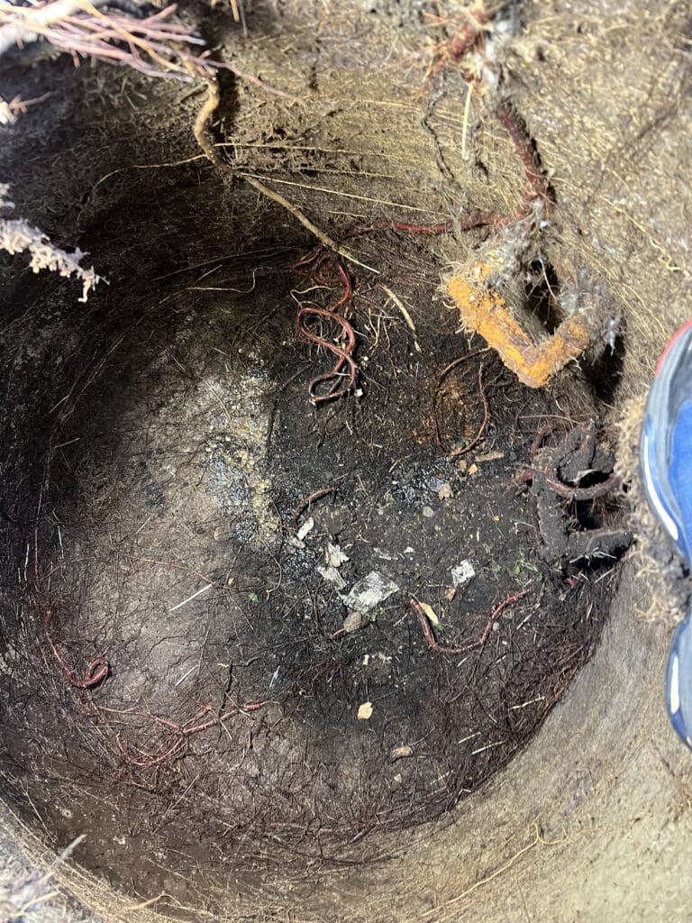 Nachdem wir den Schacht geöffnet hatten, zeigte sich die Ursache für das jahrelange Problem (siehe Bild). Massive Wurzeln waren durch kleinste Rohrverbindungen eingedrungen und hatten sich zu einem dichten Geflecht ausgewachsen.